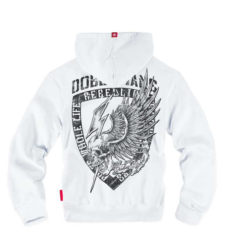Bavlněná pánská klokanka s našitou kapsou. Model oblékaný přes hlavu. U kapuce jsou široké šňůrky s kovovými zakončeními a vnitřní lemování v červené barvě. Mikina s jednobarevným vzorem v podobě štítu. Uprostřed vzoru motiv lebky s dvěma velkými křídly a bleskem. V dolní části slogan Nation Rebel vepsaný na prapor. Na hrudi je umístěno logo Dobermans Legendary Traditional Brand. Potisk s efektem předření.