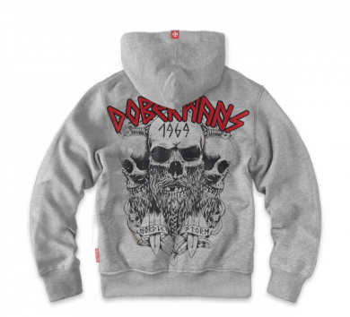 Pánská mikina s potiskem nordickém stylu. Na zadní straně grafika, která kryje téměř celý povrch zad: tři lebky Vikingů, meče a keltské ornamenty. Dodatečně nápis Nord Storm vepsán do banneru. Nahoře dvoubarevné logo Dobermans v runovém stylu. Jednotlivá písmena byla všitá na dodatečném materiále. Vepředu vyšitá číslovka 1969. Výšivka v červené barvě. Mikina klasického střihu, ukončená stahovacími lemy. Model se zipem. Má kapuci a dvě našívané kapsy. U kapuce šňůrky a kovové prvky.