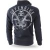 Klasická pánská mikina na zapínání s kapsami a vysokým stojáčkem. Vyrobena z bavlny o hmotnosti 320g a zakončená stahovacími lemy. Na přední straně dvě kapsy. Na zádech je jednobarevný potisk s postavou, která drží dva kulomety. Vzor má nápis Offensive a Military Series. Na levé straně hrudi je menší potisk založený na kruhu s nápisem Dobermans Offensive. Na levém rukávu je našitá tkaná cedulka s logem značky.