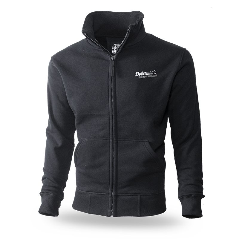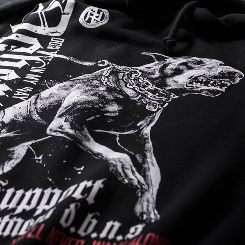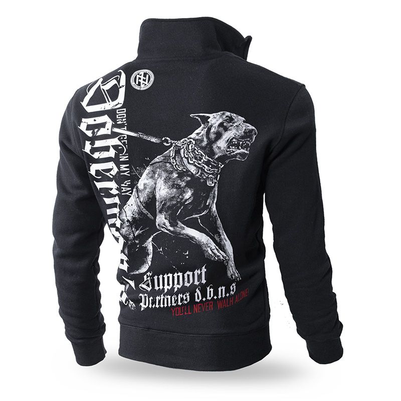 Pánská mikina na zip. Má dvě kapsy našité na přední straně. Zvýšený límec skvěle chrání krk. Dolní část mikiny a rukávů je zakončená širokými, odolnými stahovacími lemy. Oblečení je vyrobeno z bavlny o vysoké hmotnosti (320). Na levém rukávu je našitá malá cedulka s logem značky. Levá strana hrudi je zdobená nápisem Dobermans. Na zádech je velký potisk s obrazem agresivního psa na vodítku. Níže je nápis Support Partnes, a vedle Dobermans. U celého vzoru je použitý efekt poničení.