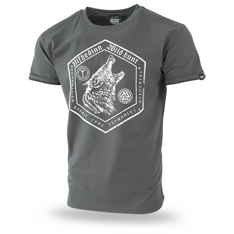 Panské tričko s potiskem klasického střihu. Tričko vyrobené z vysoce kvalitní bavlny o hmotnosti 200g. Na levém rukávu je malá cedulka s logem Dobermans Aggressive. Uprostřed na hrudi jsme umístili hrozivého vlka s otevřenou tlamou, kolem kterého se nachází runové symboly. Celek je uzavřený v šestiúhelníku. Kolem jsou nápisy vytvořené gotickým písmem a symboly, které pochází z runové abecedy, které dávají charakter celému vzoru. Na krku je malý runový symbol Valknut.