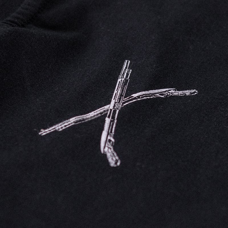 Pohodlný střih na zip, se dvěma kapsami, zakončený stahovacím lemem na rukávech, u krku a v dolní části mikiny. Na hrudi jsou zkřížené brokovnice, na jednom rukávu je cedulka a na druhém je naše logo doprovázené heslem „Time to Kill”.