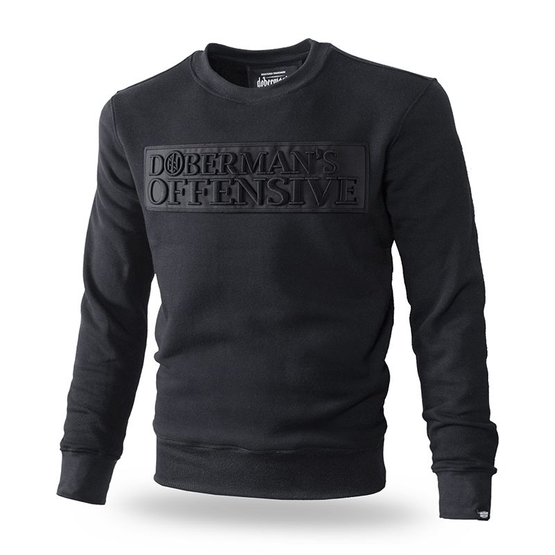 Bavlněná klasická mikina oblékaná přes hlavu. Dolní část mikiny a rukávů je zakončená širokým stahovacím lemem. Oblečení je vyrobeno z vysoce kvalitní bavlny o hmotnosti 320g. Uvnitř mikiny je velká cedulka, na levém rukávu je menší s logem značky Dobermans Aggressive. Mikina pochází z řady Offensive Premium. Oblečení z této kolekce se vyznačuje klasickými vzory, nadčasovými střihy a prémiovou kvalitou. Mikina má na hrudi černou nášivku s 3D výšivkou „Doberman’s Offensive”. Na krku je malá nášivka ve tvaru kruhu s 3D výšivkou.