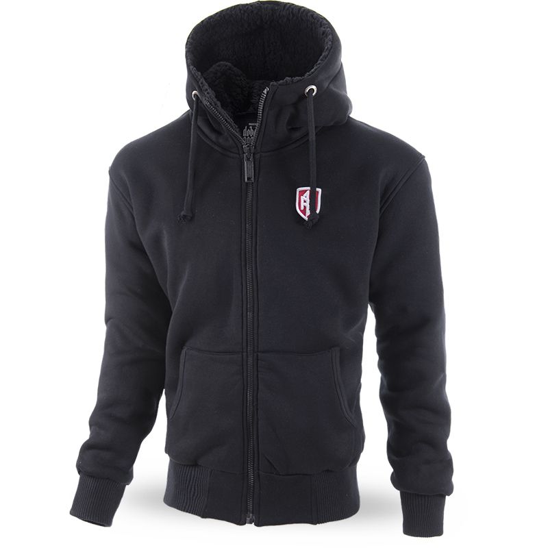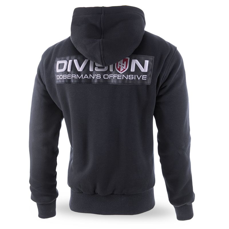 Model na zip s praktickým stojáčkem, který přechází v objemnou kapuci. U kapuce jsou široké šňůrky s kovovými zakončeními, na přední straně jsou našité dvě kapsy. V dolní části je zakončená odolnými stahovacími lemy. Mikina má na zádech černou nášivku s 3D výšivkou „DIVISION Doberman’s Offensive”.