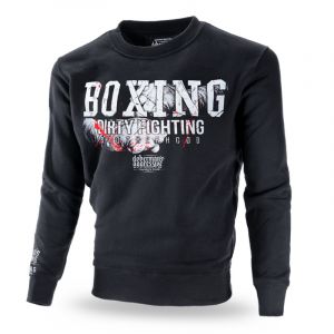 100% bavlněná mikina oblékaná přes hlavu. Dolní část mikiny a rukávy jsou zakončeny širokým stahovacím lemem. Na levém rukávu je menší s logem značky Dobermans Aggressive. Na pravém rukávu je nad zápěstím potisk s logem značky a nápisem BOXING DIRTY FIGHTING.Přední stranu zdobí velký potisk BOXING DIRTY FIGHTING s logem značky a pěstmi. Na zadní straně zmenšený motiv BOXING s logem značky.