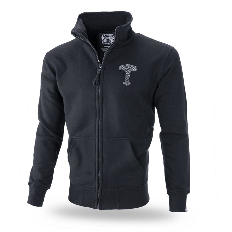 Mikina se stahovacími lemy se dvěma kapsami na přední straně. Na zádech je potisk, který zobrazuje Thorovo kladivo s nápisem HEROS JOURNEY MYTHOLOGY THORS MJOLNIR a logo Doberman’s Aggressive. Na levé přední straně hrudi je miniatura vzoru Thorova kladiva.