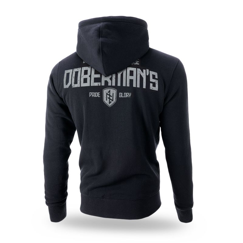 Mikina s kapucí se zapínáním na zip. Vyrobená z vysoce kvalitní bavlny, má dvě kapsy na přední straně, zakončená stahovacími lemy. Na levém rukávu je malá cedulka s logem značky. Kapuce je ozdobená širokou šňůrkou a kovovými zakončeními s logem značky. Zatímco vpředu je malý potisk na prsou,na zádech naopak velký potisk Dominus Vitae Necisque DOBERMAN’S doplněný o štít s runami a spojením Pride – Glory.