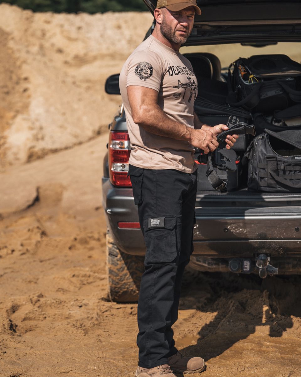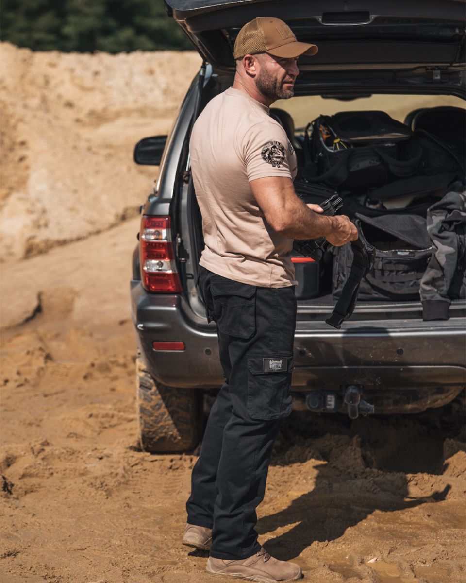 Pánské kalhoty typu cargo se šesti kapsami: dvěma na bocích, dvěma na stehnech a dvěma zadními kapsami. Kapsy na stehnech a zadní kapsy mají klopy na suchý zip. Na pravé kapse na stehně se nachází tkaná nášivka s logem značky. Pásek není součástí kalhot!