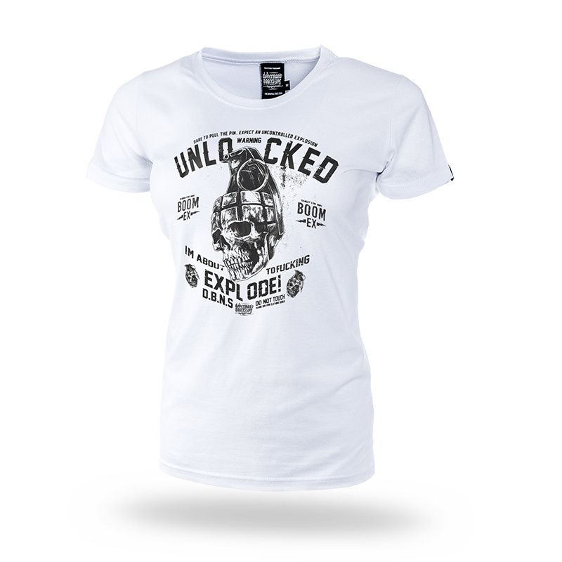 Dámské tričko v mírně vypasovaném střihu. Na levém rukávu je umístěna malá cedulka s logem značky. Vpředu a vzadu potisk "Unlocked explode!"