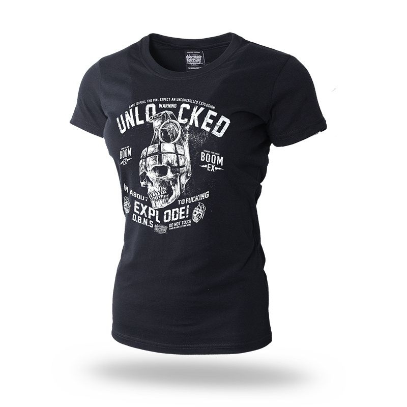 Dámské tričko v mírně vypasovaném střihu. Na levém rukávu je umístěna malá cedulka s logem značky. Vpředu a vzadu potisk "Unlocked explode!"