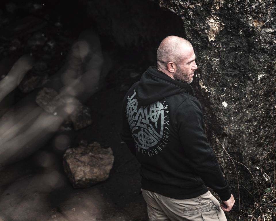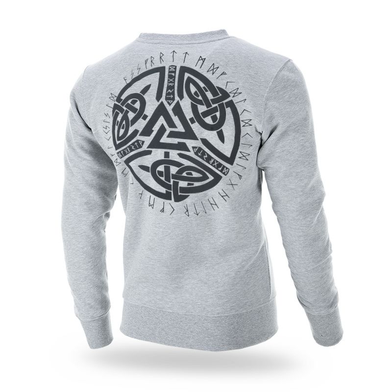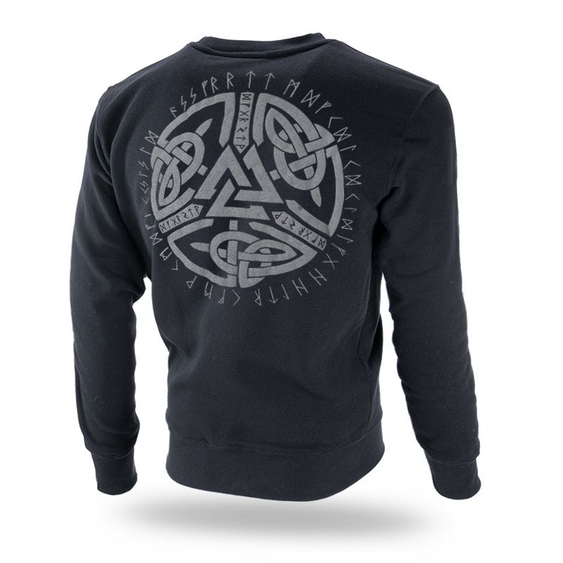 Pánská mikina oblékaná přes hlavu. Na levém rukávu je malá cedulka s logem značky. Dolní část mikiny a rukávů je zakončená širokým stahovacím lemem. Na přední straně se nachází nápis Valhalla vytvořený vypouklým potiskem doplněný o severské symboly.