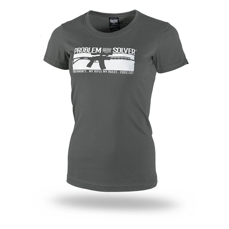 Dámské tričko v mírně vypasovaném střihu. Na levém rukávu je umístěna malá cedulka s logem značky. Na přední straně vzor kulometu s nápisem nápisem PROBLEM SOLVER.