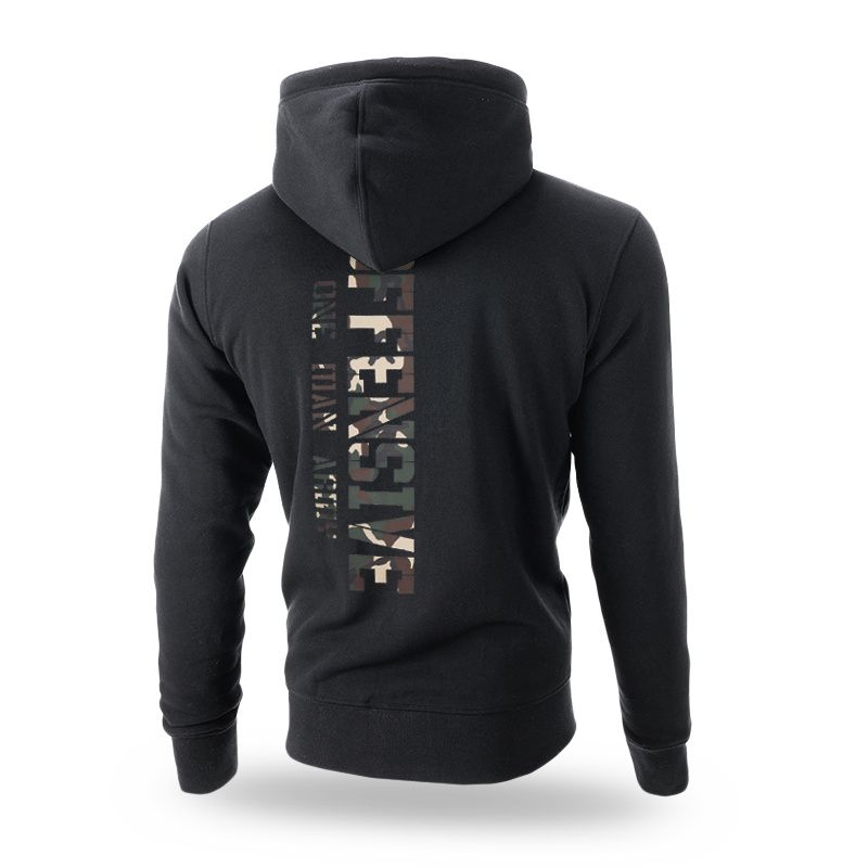 Mikina s kapucí se zapínáním na zip. Vyrobená z vysoce kvalitní bavlny, má dvě kapsy na přední straně, zakončená stahovacími lemy. Na levém rukávu je malá cedulka s logem značky. Kapuce je ozdobená širokou šňůrkou a kovovými zakončeními s logem značky. Po celé linii zad je velký potisk "Offensive One Man Army".