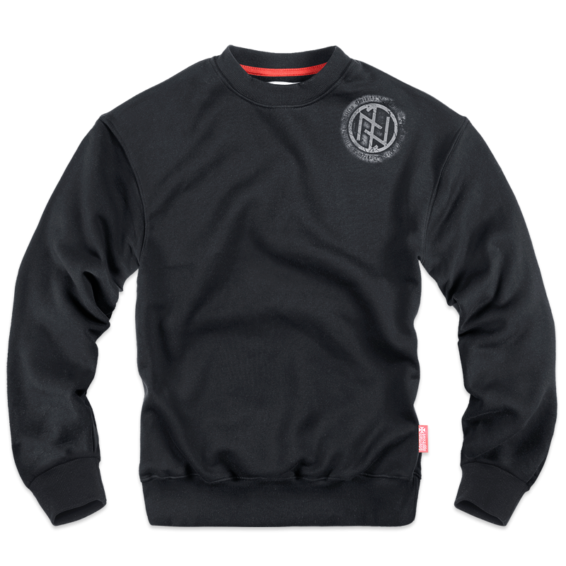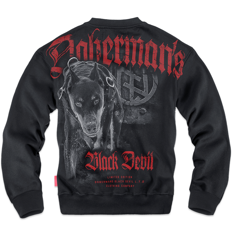 Pánská mikina s klasickým motivem kolekce Dobermans. Zadní strana výrobku je zdobená vzorem s efektem popraskání. Uprostřed vzoru silueta dobrmana, výše velký potisk Doberman's přecházející přes švy rukávů, v dolní části nápis Black Devil. Použité gotické písmo. Na levém rameni vytištěný kruh s runovými znaky. Mikina klasického typu. Má jednoduchý střih a odolné stahovací lemy, u krku je viditelné vnitřní lemování v kontrastní barvě. Vyrobena z bavlny vysoké kvality.