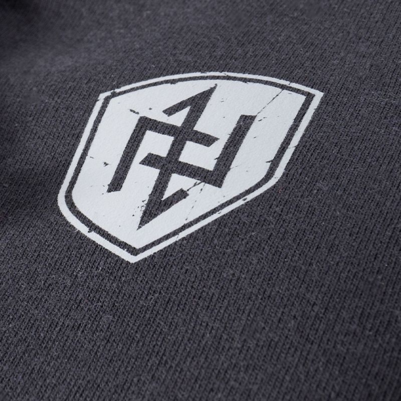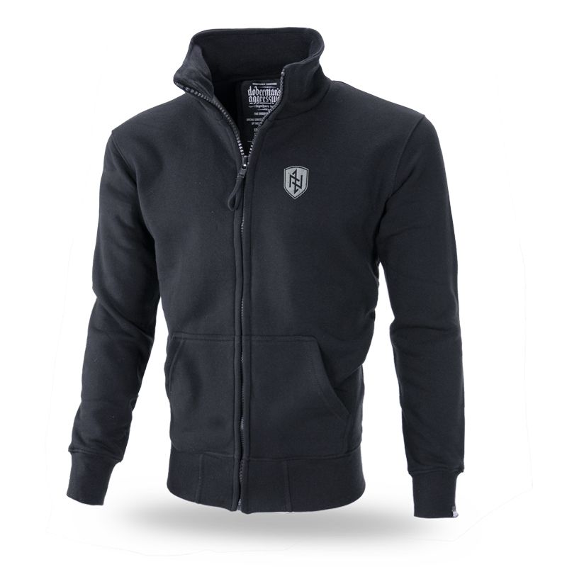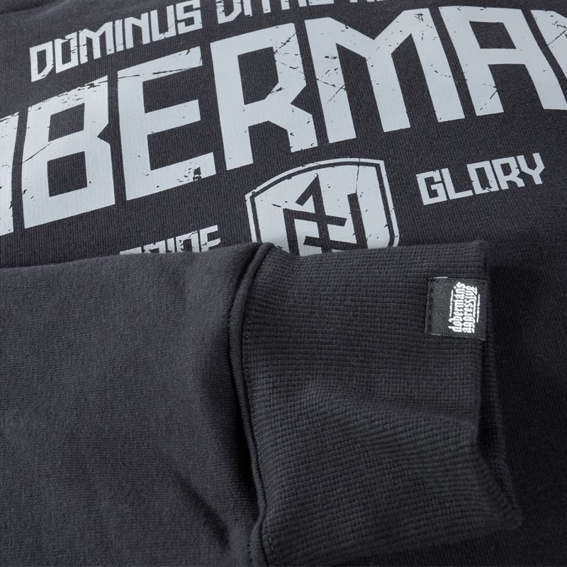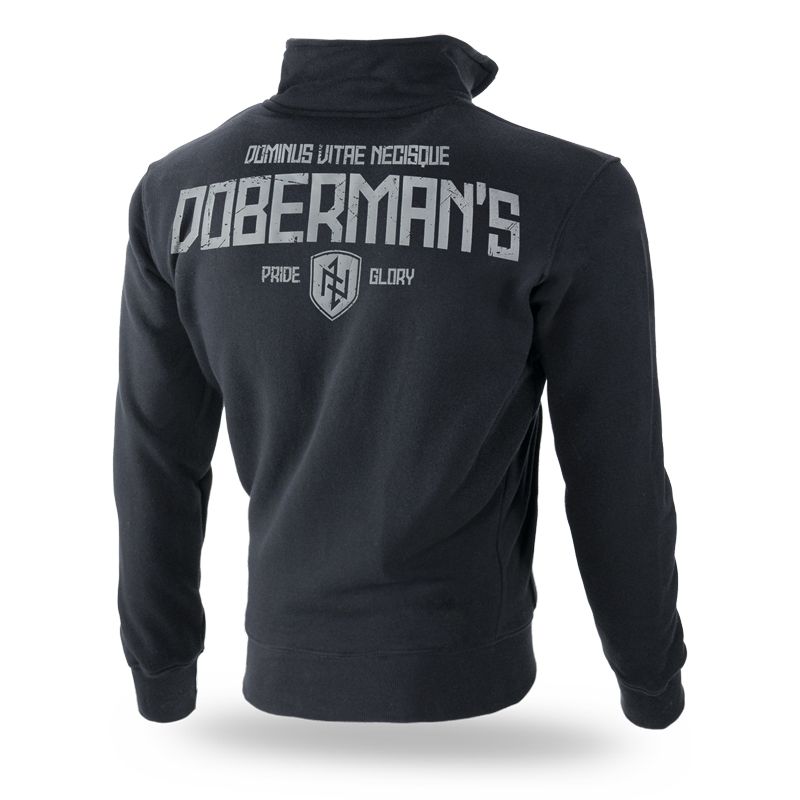 Mikina se stahovacími lemy se dvěma kapsami na přední straně. Zatímco vpředu je malý potisk na prsou,na zádech naopak velký potisk Dominus Vitae Necisque DOBERMAN’S doplněný o štít s runami a spojením Pride – Glory.