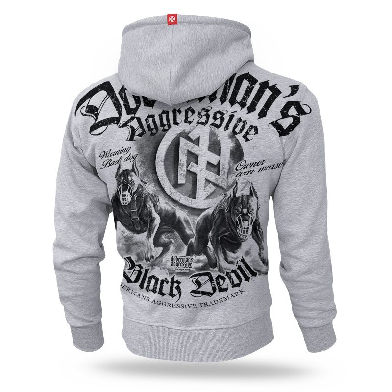 Mikina se zapínáním na zip z vysoce kvalitní bavlny o hmotnosti 320g. Model má hlubokou kapuci s kovovými zakončeními, kterou je možné nastavit pomocí šňůrky. Zvýšený límec skvěle chrání před chladem. Rukávy a dolní část mikiny je zakončená širokým stahovacím lemem. Na levém rukávu je malá cedulka s logem firmy. Nápis Dobermans Black Devil je vytištěný na levém rameni na přední straně mikiny. Zadní část zabírá vzor se dvěma dobrmany v náhubcích. V zadní části je runový znak. Výše je velký nápis, který přechází přes oba švy rukávů. Vzor z řady Dobermans Black Devil.