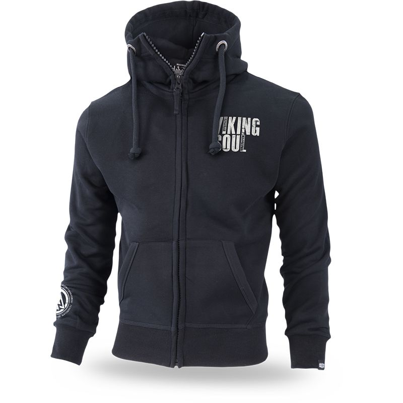 Pánská mikina vyrobená z bavlny. Model má dvě velké kapsy a zip na přední straně. Vysoký límec přechází v kapuci, kterou je možné nastavit šňůrkami. Dolní část je zakončená širokým stahovacím lemem. Dolní část pravého rukávu je ozdobená potiskem kruhu s runovými symboly. Na zádech se nachází velký potisk s nápisem Viking Soul. V nápisu jsou vyřezané tvary, které navazují na severskou mytologii. Na levé straně hrudi je menší potisk s názvem modelu. Vzory s efektem poničení.