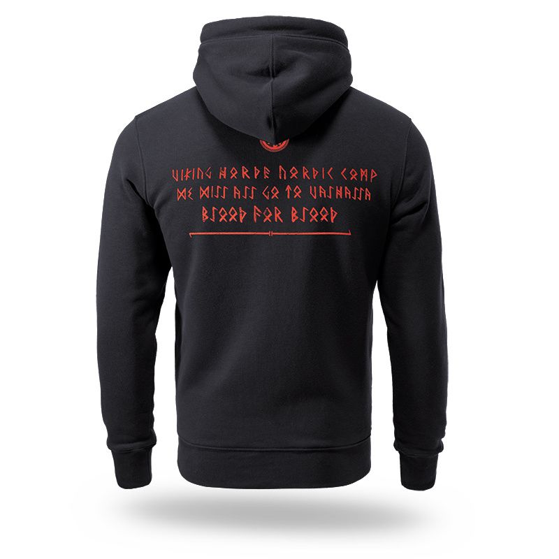 Mikina s kapucí od Dobermans Aggressive je vyrobena z příjemné, pohodlné bavlny,zakončena širokými, elastickými stahovacími lemy jak v pase, tak i na rukávech. Na dvojitě prošité kapuci je velké logo Doberman’s Aggresive. Na přední straně trička se nachází vzor, který zobrazuje útočící Vikingy s nápisem VIKING HORDE. Na zadní straně text v runových symbolech.