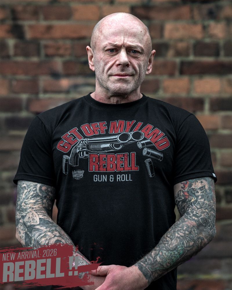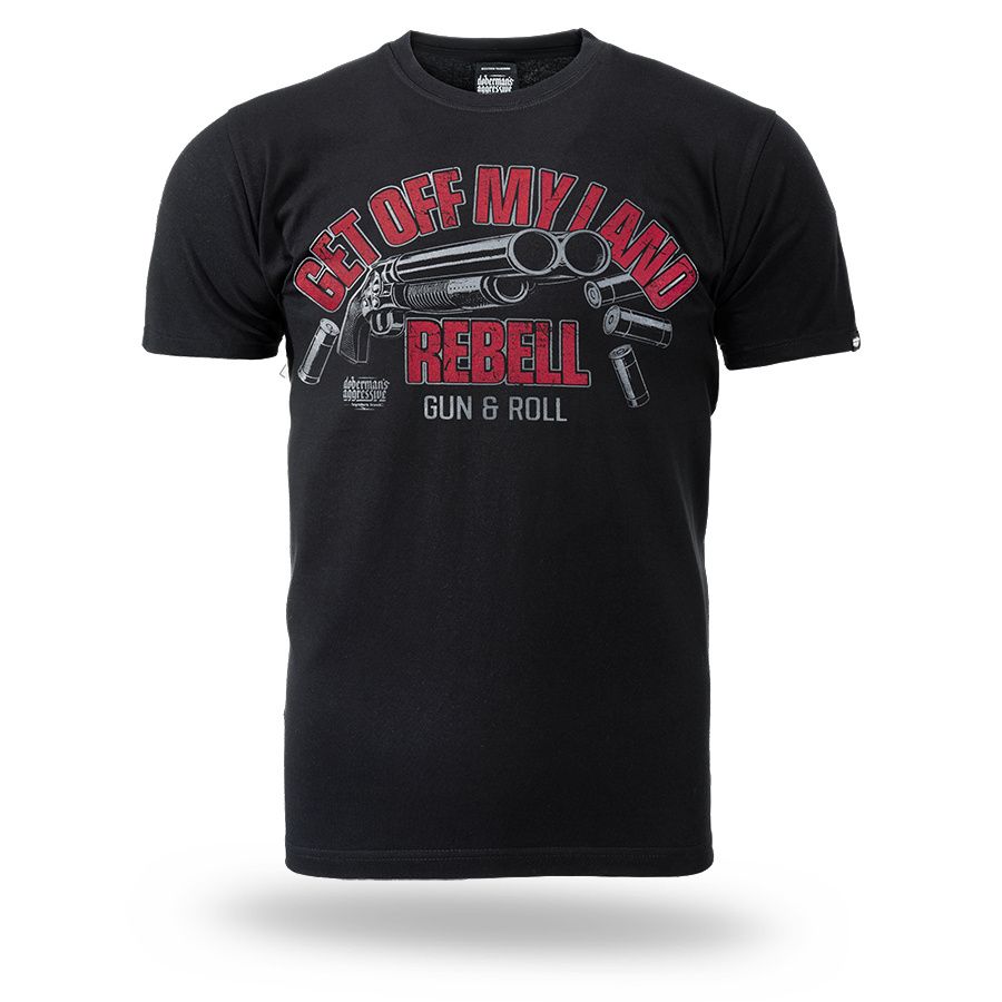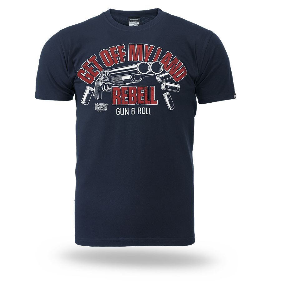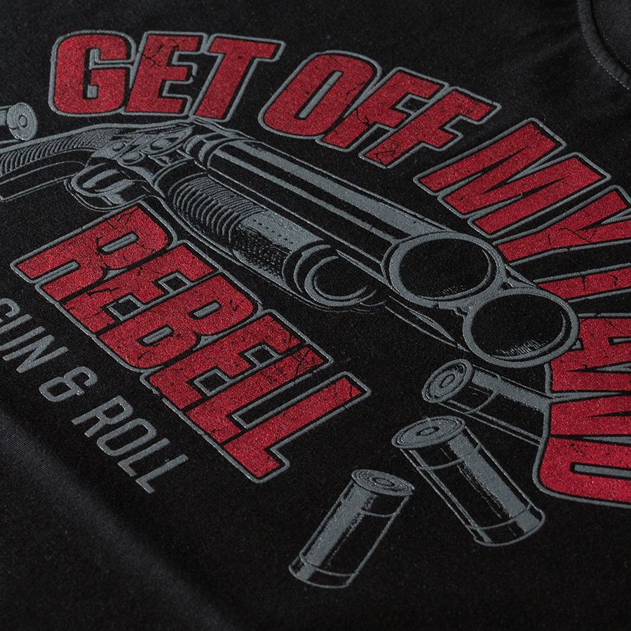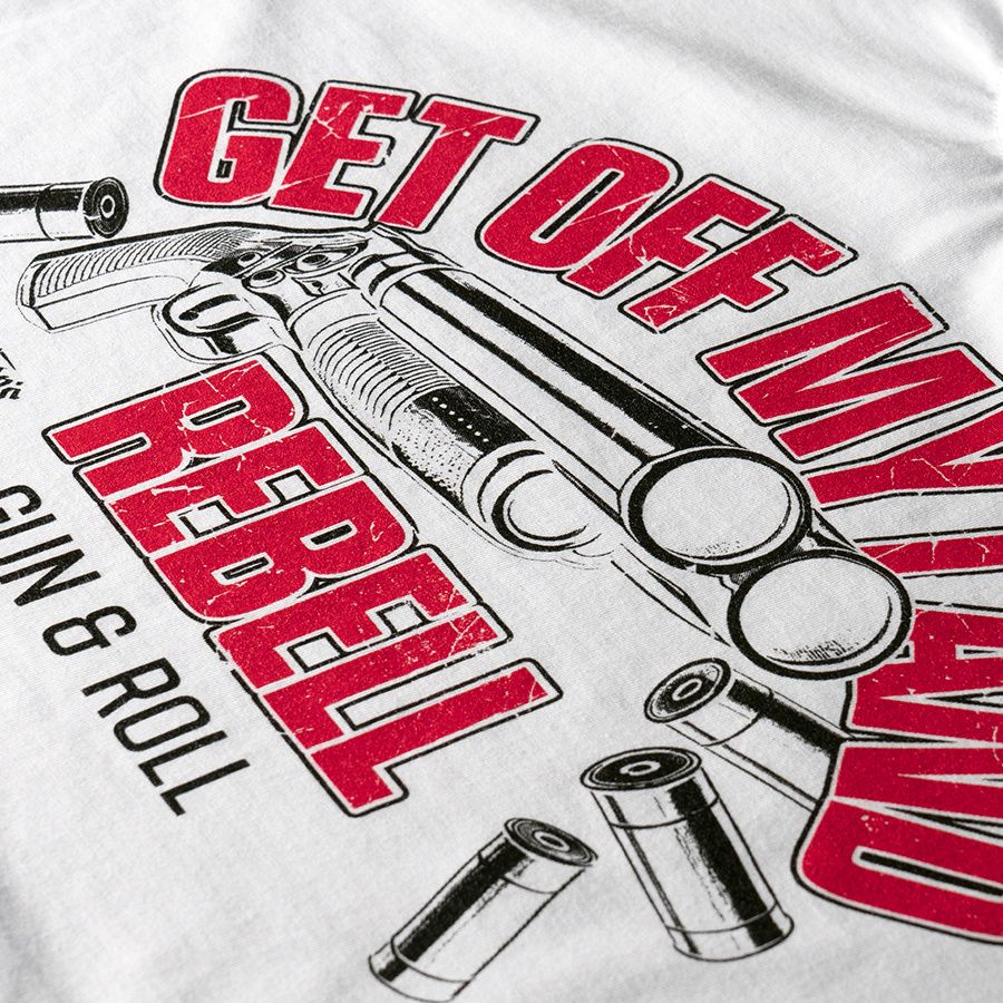Pánské tričko ze 100% bavlny klasického střihu s krátkým rukávem. Na levém rukávu je umístěna malá cedulka s logem značky. Na hrudníku velký potisk Get Off My Land REBELL Gun & Roll.