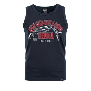Pánský nátělník. Na přední straně je velký potisk s nápisem Get Off My Land REBELL Gun & Roll.