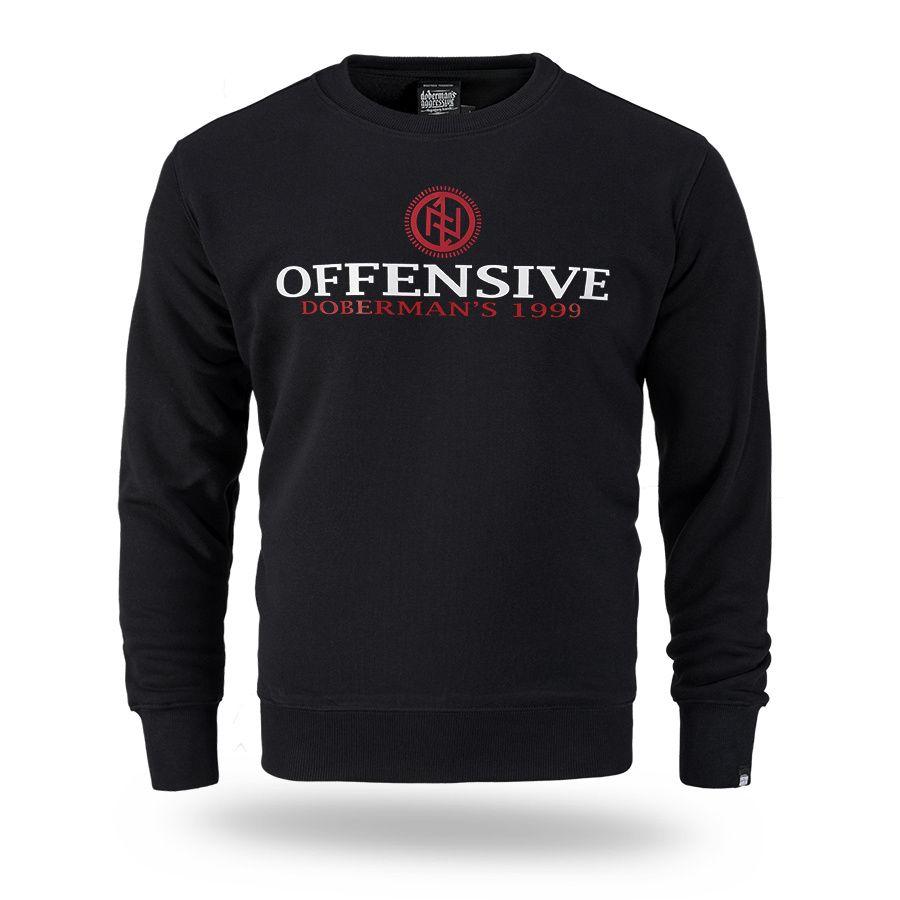 Klasická pánská mikina oblékaná přes hlavu. Na levém rukávu je malá cedulka s logem značky. Dolní část mikiny a rukávů je zakončená širokým stahovacím lemem. Na hrudníku velký potisk Offensive Doberman´s 1999.