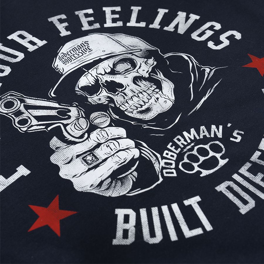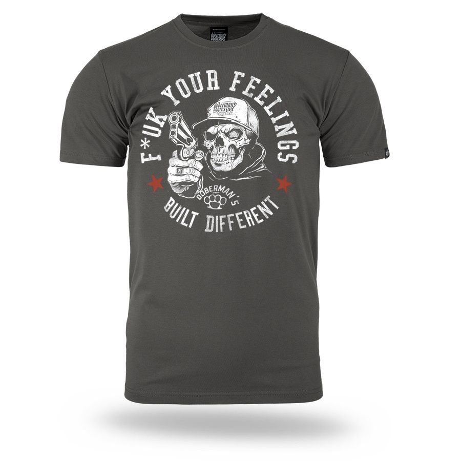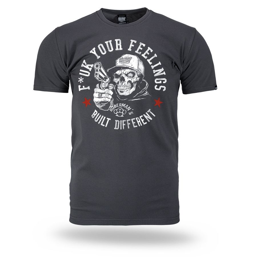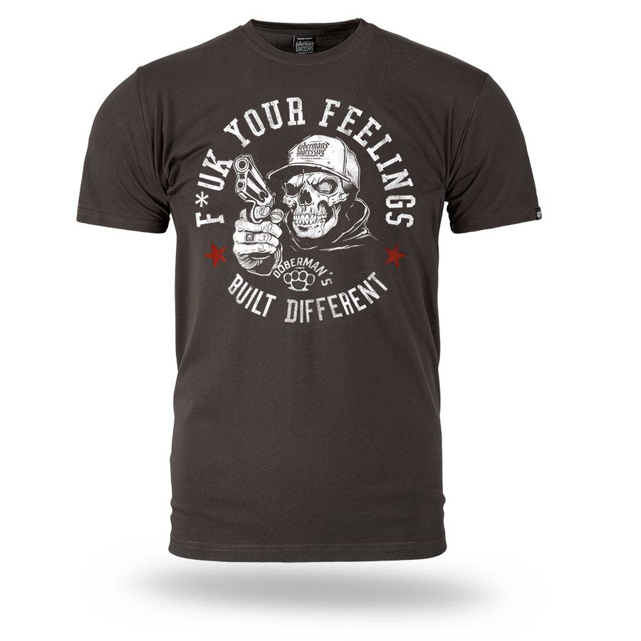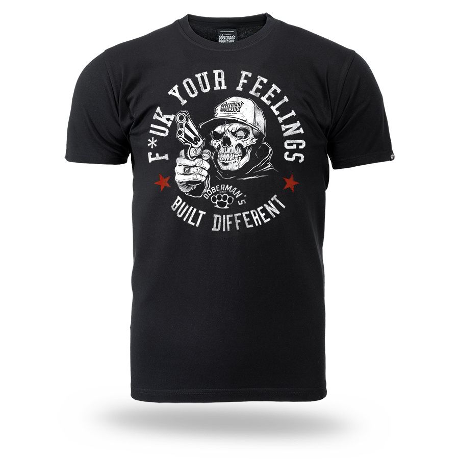 Pánské tričko ze 100% bavlny klasického střihu s krátkým rukávem. Na levém rukávu je umístěna malá cedulka s logem značky. Na hrudníku velký potisk F*ck Your Feelings – Built Different.