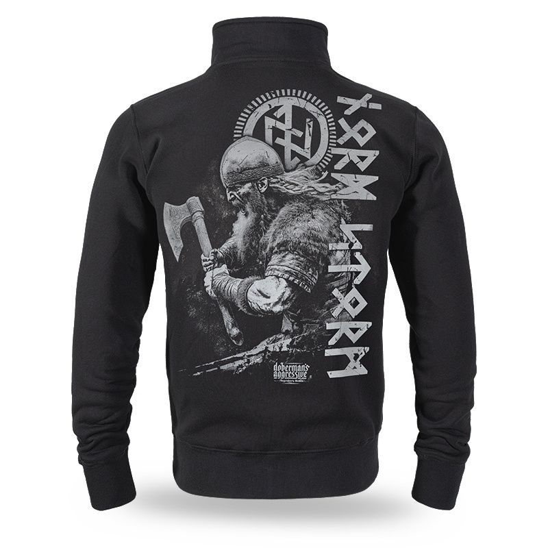 Mikina na zip se stahovacími lemy se dvěma kapsami na přední straně ze 100% bavlny. Na zadní straně je velký potisk válečníka se sekerou a runovými symboly. Na přední straně minimalistický potisk Storm.