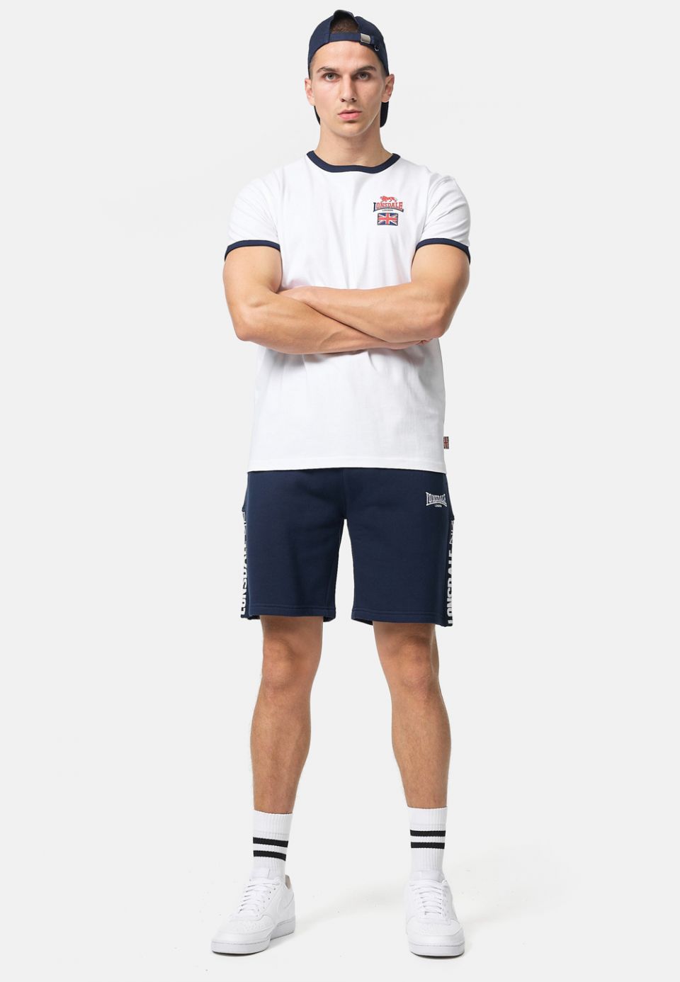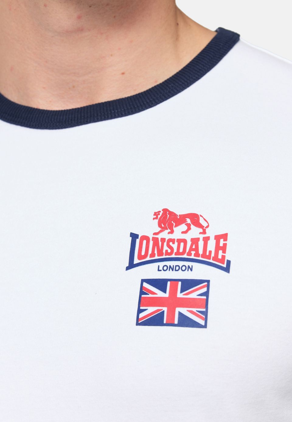 - Tričko s kulatým výstřihem a malým 3D gumovým potiskem na levé straně hrudi. Design britské vlajky se opakuje jako tkaný štítek na bočním švu. Manžety a výstřih jsou v kontrastní barvě.