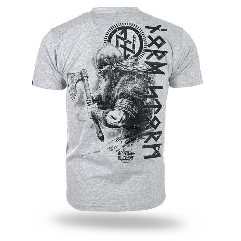 Triko je vyrobeno z bavlny o hmotnosti 200g. Na levém rukávu je malá cedulka s logem Doberman’s Aggressive. Na zadní straně je velký potisk válečníka se sekerou a runovými symboly. Na přední straně minimalistický potisk Storm.